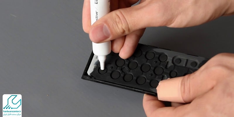 از ریموت کنترل و اتصالات آن یک عکس بگیرید. تخته مدار و صفحه کلید را به صورت کلی و با یک گوش پاک کن آغشته به الکل پاکسازی کنید. میتوانید مقداری رنگ رسانا تهیه کنید. رنگ رسانا داخل کیت های تعمیراتی هم وجود دارد. چند چوب کبریت را به رنگ آغشته کنید و این بار سطح تمام دکمه های لاستیکی را با استفاده از آن پوشش دهید. مدت یک شبانهروز صبر کنید تا رنگها خشک شود.